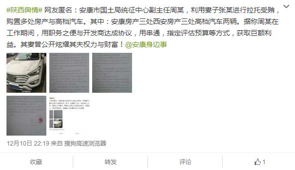 安康市國土局統(tǒng)征中心副主任周某,利用妻子張某進行拉托受賄,購置多處房產(chǎn)與高檔汽車。其中:安康房產(chǎn)三處,西安房產(chǎn)三處,高檔汽車兩輛。據(jù)稱,周某在工作期間,用職務(wù)之便與開發(fā)商達成協(xié)議,用串通,指定評估預(yù)算等方式,獲取巨額利益。其妻曾公開炫耀其夫權(quán)力與財富!