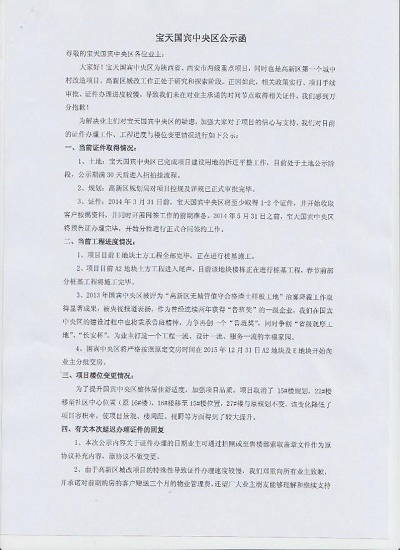 近日,本報不斷地接到購房者反映,寶天集團(tuán)開發(fā)的“國賓中央?yún)^(qū)”雖然在2013年底因為無證銷售被處罰后,現(xiàn)在仍然正常銷售,并且在置業(yè)顧問承諾多次后還是沒有取得《商品房預(yù)售許可證》,希望記者調(diào)查了解那么事實究竟是如何,本報記者前往售樓部一探究竟。