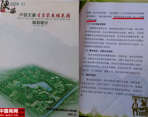 2014年之前,對于陜西省戶縣龐光鎮(zhèn)王寨村大多數(shù)村民來說,從來沒有聽說過他們村在2009年有一份規(guī)劃設(shè)計(jì),計(jì)劃在村子里面修建540畝的水域,發(fā)展生態(tài)觀光園。直到前幾個(gè)月村民在王寨村村委會(huì)偶然看到這份“規(guī)劃設(shè)計(jì)”。這份“規(guī)劃設(shè)計(jì)”全名為《陜西戶縣王寨生態(tài)農(nóng)業(yè)觀光園規(guī)劃設(shè)計(jì)》,厚達(dá)44頁,封面右下角寫著“長安大學(xué)城市規(guī)劃設(shè)計(jì)研究院”,時(shí)間為2009年7月。仔細(xì)翻閱后,令王寨村村民大吃一驚?!斑@也太嚇人了,錯(cuò)誤頻發(fā),”一位村民說。在第12頁第二行赫然寫著“使本園成為全國一流,江蘇第一的生態(tài)園”。