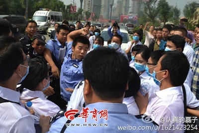 9月20日下午1時許,網(wǎng)友發(fā)微博稱,曲江中海城業(yè)主因開發(fā)商欺騙業(yè)主,霸王條款,房屋質(zhì)量存在隱患等,多名業(yè)主要求退房。隨后中海城開發(fā)商選擇報警,處警民警與業(yè)主發(fā)生沖突,一名身著警服的男子向業(yè)主揮拳,華商網(wǎng)編輯隨即從西安市公安局雁塔分局了解到,揮拳警察為協(xié)警,并非正式民警。