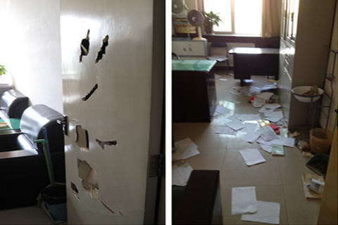 被砸的現(xiàn)場一片狼藉,門窗被砸壞,文件隨地亂扔