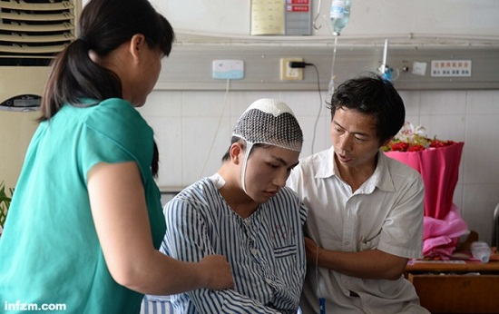 2014年6月7日,高三學(xué)生徒手奪刀重傷錯過高考,網(wǎng)友呼吁“破格錄取”。6月7日,柳艷兵的父母在病房照顧他。(新華社記者 吳鍾昊/圖)