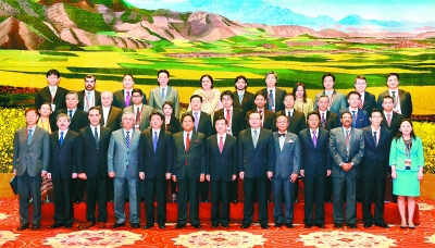 出席亞洲合作對話絲綢之路務(wù)實合作論壇的各國代表團(tuán)團(tuán)長與參會嘉賓合影。