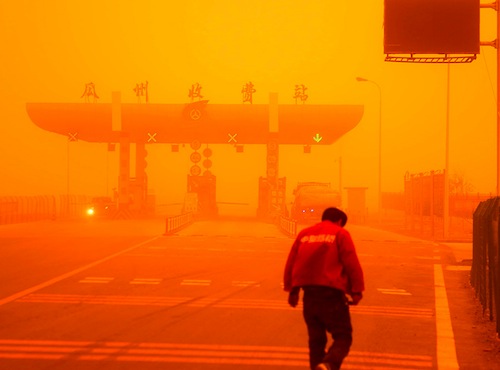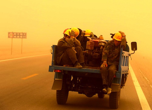 4月23日,一輛拉載公路施工人員的三輪車在沙塵暴中行駛在酒泉市瓜州縣城郊的公路上。當(dāng)日,甘肅省酒泉市的敦煌市、瓜州縣等地遭受特強(qiáng)沙塵暴襲擊,最小能見(jiàn)度不足20米。當(dāng)日下午,酒泉市氣象臺(tái)發(fā)布沙塵暴紅色預(yù)警信號(hào)。新華社記者聶建江攝