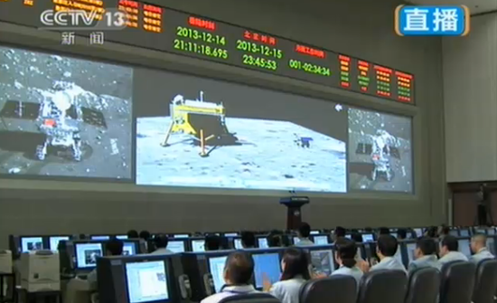 探測器著陸器順利互拍,五星紅旗完美展現(xiàn)。中國探月工程總指揮馬興瑞宣布,嫦娥三號(hào)任務(wù)取得圓滿成功。