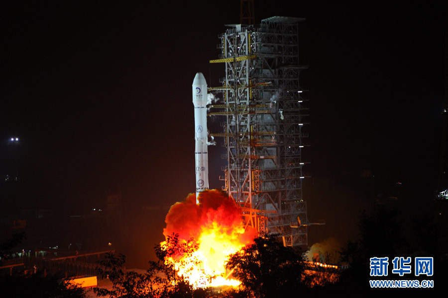 2013年12月1日19時(shí)30分,西昌衛(wèi)星發(fā)射場(chǎng)。群山環(huán)抱中,長(zhǎng)征三號(hào)乙運(yùn)載火箭靜靜地佇立在二號(hào)發(fā)射塔架旁。