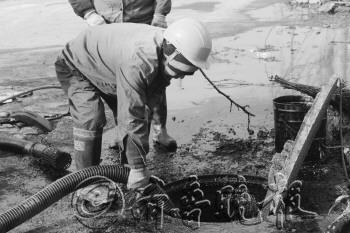 25日中午,記者在事故現(xiàn)場看到,由于已經(jīng)過了救援的黃金72小時(shí),救援官兵開始清理散落的大型石塊,在事故中被掀翻的車輛也早被移走。在秦皇島路與齋堂島街交叉口的暗渠位置,一部200噸級的重型吊車和一部300噸級的重型吊車正在忙著清理暗渠里面的石塊。由于前一天雨下得比較大,暗渠里的水位有所上升,破裂的輸油管道已經(jīng)干癟,泄漏出來的大量的油污集中在這個(gè)暗渠中,對清理現(xiàn)場造成了很大的困難。被突然爆炸沖斷的大塊鋼筋混凝土跌落在暗渠內(nèi),只有一部分露出水面,救援官兵要做的就是人工用鋼絲繩將鋼筋混凝土塊系住,再用重型吊車將其吊到岸上,以便尋找可能壓在下面的遇難人員。4名消防官兵沿著暗渠邊緣踩著碎石塊慢慢地下到其中,黑色的油污水立即將他們的鞋淹沒,官兵們顧不上這些,費(fèi)勁地將鋼絲繩系在大石塊上。