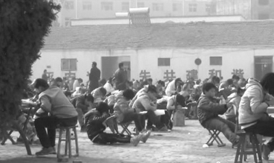 距臺前縣政府1公里之遙的城鎮(zhèn)中學(xué),由于教室不充裕,學(xué)生在室外空地上考試。網(wǎng)絡(luò)截圖