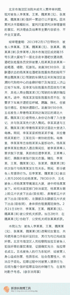 據(jù)北京法院網(wǎng)消息,海淀法院于26日上午9時(shí)30分公開宣判被告人李某某、王某、魏某某(兄)、張某某、魏某某(弟)強(qiáng)奸一案。被告人李某某犯強(qiáng)奸罪,被判處有期徒刑十年。