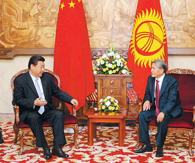 兩國元首共同會(huì)見了記者。習(xí)近平指出,中吉關(guān)系提升為戰(zhàn)略伙伴關(guān)系,為今后兩國關(guān)系發(fā)展提出了新目標(biāo)。雙方將以此為新起點(diǎn),增進(jìn)政治互信,深化互利合作,更好造福兩國人民。我相信,在中國和中亞國家共同努力下,“絲綢之路經(jīng)濟(jì)帶”一定會(huì)在不遠(yuǎn)的將來收獲豐碩成果。