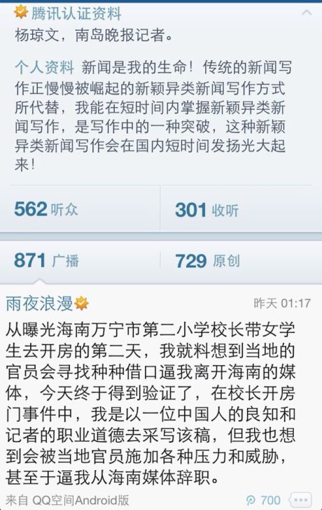 8月8日凌晨1點17分,認(rèn)證資料為《南島晚報》記者楊瓊文的微博用戶稱:“因曝光海南校長開房事件,遭到了當(dāng)?shù)卣賳T的壓力和威脅,甚至逼迫其離開海南媒體,在報道之初就料想到這樣的結(jié)果,昨天終于得到驗證?!苯?jīng)本網(wǎng)海南頻道記者調(diào)查確認(rèn),目前楊瓊文已經(jīng)確定將離開《南島晚報》。