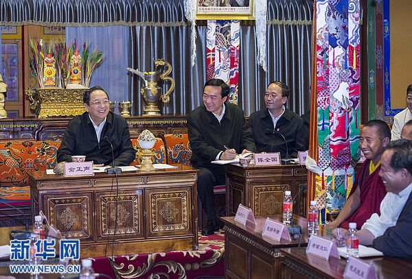 俞正聲十分關心藏傳佛教的健康發(fā)展。他專程前往大昭寺、哲蚌寺、孝登寺、西藏佛學院,與寺廟僧尼和駐寺干部親切交談。俞正聲指出,只有祖國強大、社會發(fā)展、群眾生活改善,藏傳佛教才能健康發(fā)展。他強調(diào),十四世達賴喇嘛所主張的“大藏區(qū)”“高度自治”完全違反了中國憲法和法律,也違背了藏傳佛教的根本利益。藏傳佛教界要認清達賴集團分裂本質(zhì),堅決維護祖國統(tǒng)一、民族團結(jié)和西藏的和諧穩(wěn)定。要全面貫徹落實黨的民族宗教政策,切實加強“三個離不開”教育,積極引導宗教與社會主義社會相適應,努力促進民族團結(jié)、宗教和睦,為維護社會和諧穩(wěn)定營造良好環(huán)境。