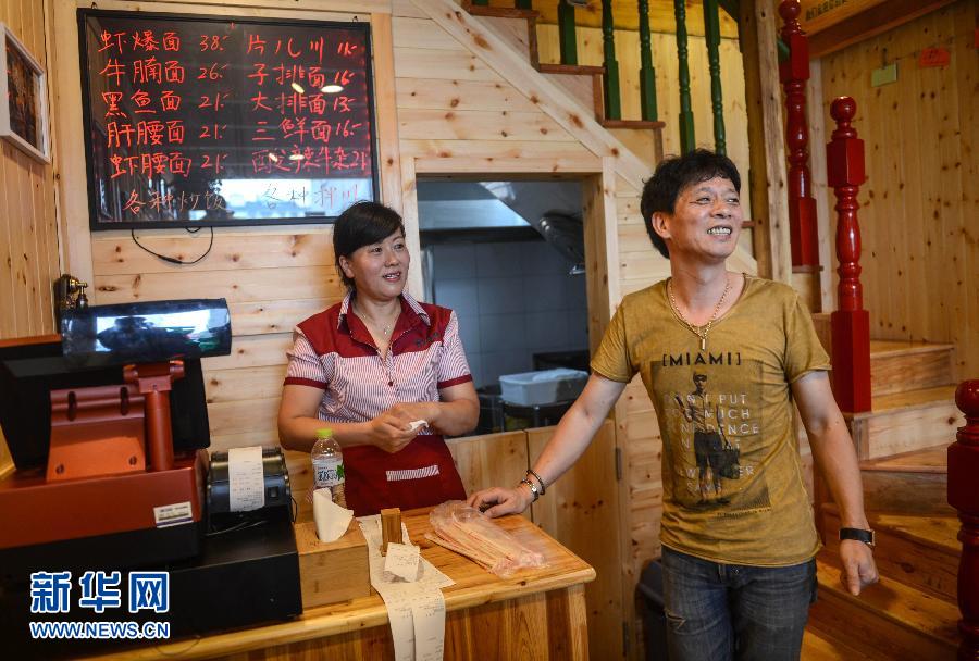 6月24日,成良面館老板張成良(右)在面館里與顧客聊天。
