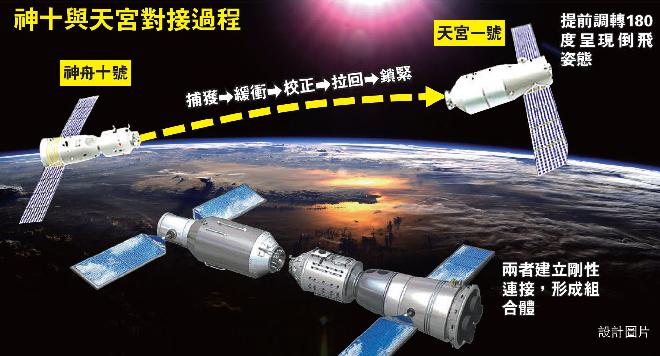 在北京航天飛行控制中心就對接準(zhǔn)備狀態(tài)進(jìn)行最終確認(rèn)后,神舟十號開始向天宮一號緩緩靠攏。13時11分,神舟十號與天宮一號對接環(huán)接觸,在按程序順利完成一系列技術(shù)動作后,對接機(jī)構(gòu)鎖緊,兩飛行器連接形成組合體。