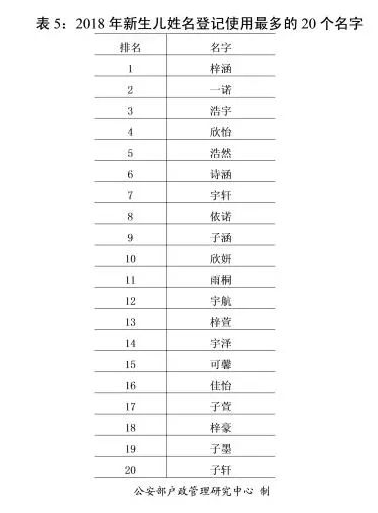 2018年進(jìn)行戶籍登記的新生兒姓名,使用頻率最高的20個(gè)名字由高到低依次為:“梓涵”“一諾”“浩宇”“欣怡”“浩然”“詩(shī)涵”“宇軒”“依諾”“子涵”“欣妍”“雨桐”“宇航”“梓萱”“宇澤”“可馨”“佳怡”“子萱”“梓豪”“子墨”“子軒”。