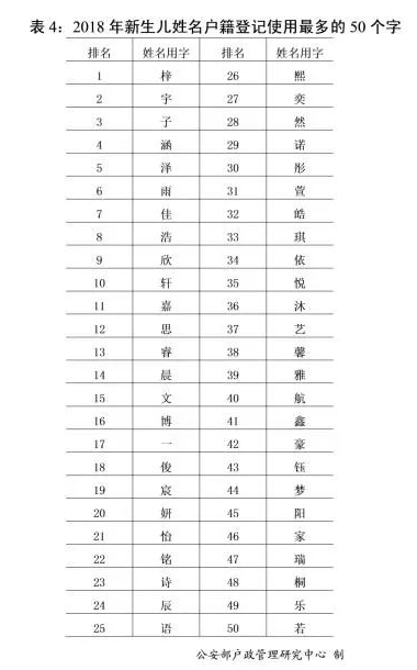 姓名用字,往往承載著父母對(duì)子女的美好期望,也具有鮮明的時(shí)代特色。2018年,公安機(jī)關(guān)登記的新生兒名字中,使用頻率最高的50個(gè)字為“梓”“宇”“子”“涵”“澤”“雨”“佳”“浩”“欣”“軒”等。