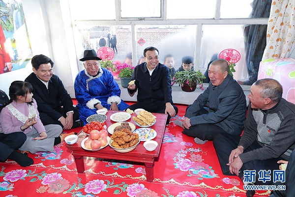 2月1日至2日,中共中央政治局常委、國務(wù)院總理李克強在內(nèi)蒙古自治區(qū)烏蘭察布市考察。這是2月1日,李克強在察哈爾右翼前旗三岔口鄉(xiāng)十二洲村慰問貧困戶。 新華社記者 姚大偉 攝