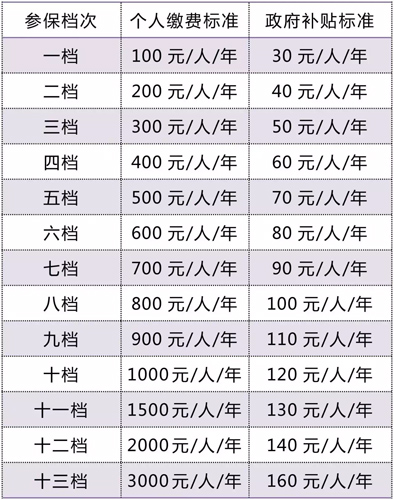 調(diào)整后的個(gè)人繳費(fèi)及政府補(bǔ)貼標(biāo)準(zhǔn)如下: