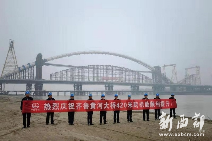 3月15日,隨著重達(dá)6800噸的主跨拱肋整體提升到位,標(biāo)志著由中國(guó)中鐵工業(yè)旗下中鐵寶橋集團(tuán)參建的齊魯黃河大橋420米主跨鋼拱肋順利合龍,也標(biāo)志著世界最大、最寬下承式網(wǎng)狀系桿拱橋主跨合龍。