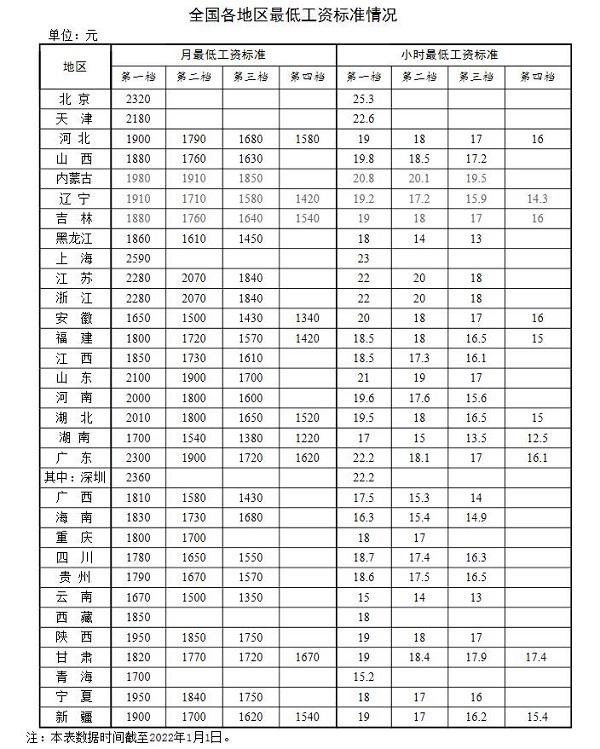 全國各地區(qū)最低工資標準情況(截至2022年1月1日)。來自人社部網(wǎng)站