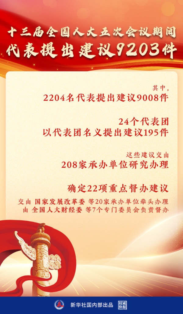 新華社北京4月1日電(記者任沁沁)記者1日從在京召開(kāi)的十三屆全國(guó)人大五次會(huì)議代表建議交辦會(huì)上獲悉,今年十三屆全國(guó)人大五次會(huì)議期間,代表們共提出建議9203件。其中,2204名代表提出建議9008件,24個(gè)代表團(tuán)以代表團(tuán)名義提出建議195件。經(jīng)逐件研究分析,9203件代表建議分別交由208家承辦單位研究辦理。