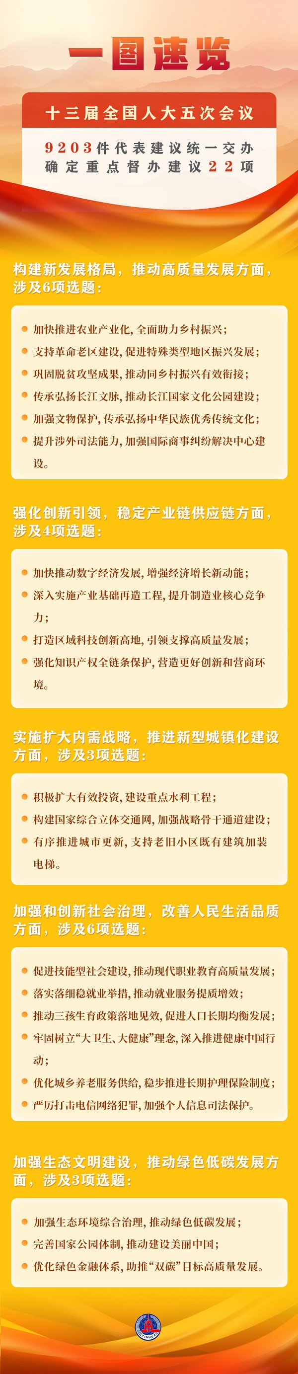 對(duì)代表建議進(jìn)行重點(diǎn)督辦,是提高代表建議辦理質(zhì)量的行之有效的工作機(jī)制。結(jié)合貫徹落實(shí)黨中央重大決策部署和對(duì)代表建議梳理分析情況,全國(guó)人大常委會(huì)辦公廳確定了22項(xiàng)重點(diǎn)督辦建議。其中,構(gòu)建新發(fā)展格局,推動(dòng)高質(zhì)量發(fā)展方面,涉及6項(xiàng)選題;強(qiáng)化創(chuàng)新引領(lǐng),穩(wěn)定產(chǎn)業(yè)鏈供應(yīng)鏈方面,涉及4項(xiàng)選題;實(shí)施擴(kuò)大內(nèi)需戰(zhàn)略,推進(jìn)新型城鎮(zhèn)化建設(shè)方面,涉及3項(xiàng)選題;加強(qiáng)和創(chuàng)新社會(huì)治理,改善人民生活品質(zhì)方面,涉及6項(xiàng)選題;加強(qiáng)生態(tài)文明建設(shè),推動(dòng)綠色低碳發(fā)展方面,涉及3項(xiàng)選題。