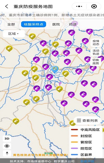 “渝康碼”以及百度、高德、騰訊、美團(tuán)等地圖上線了“重慶防疫服務(wù)地圖”,方便群眾一圖查詢(xún)核酸采樣點(diǎn)、疫情動(dòng)態(tài)、感染者活動(dòng)軌跡、醫(yī)院、藥店、封控管控防范“三區(qū)”以及生活服務(wù)等信息,并為市民提供相關(guān)查詢(xún)、預(yù)約、導(dǎo)航等服務(wù)。
