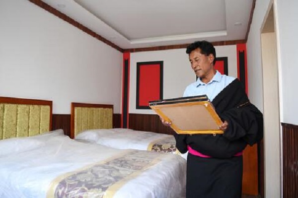 甘南藏族自治州碌曲縣尕海鎮(zhèn)尕秀村村民拉毛加在收拾自家開辦的藏家樂客房。新華社記者陳斌攝