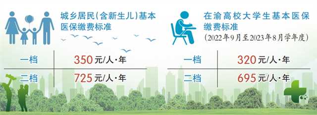 《通知》明確指出重慶2023年度城鄉(xiāng)居民醫(yī)療保險(xiǎn)費(fèi)的參保標(biāo)準(zhǔn)為:城鄉(xiāng)居民(含新生兒)繳費(fèi)標(biāo)準(zhǔn)為一檔350元/人·年,二檔725元/人·年;在渝高校大學(xué)生參加2022年9月至2023年8月學(xué)年度城鄉(xiāng)居民基本醫(yī)療保險(xiǎn),繳費(fèi)標(biāo)準(zhǔn)為一檔320元/人·年、二檔695元/人·年。