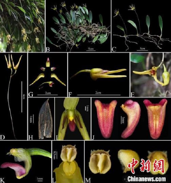 據(jù)程躍紅介紹,“我們通過持續(xù)跟蹤觀測其在原生地的生長情況、查閱相關文獻資料、對比相近種標本、開展分子系統(tǒng)研究及與行業(yè)專家討論,最終確定其為石豆蘭屬一新種。因模式產(chǎn)地在臥龍國家級自然保護區(qū)內,故將其命名為臥龍卷瓣蘭?!?/p>