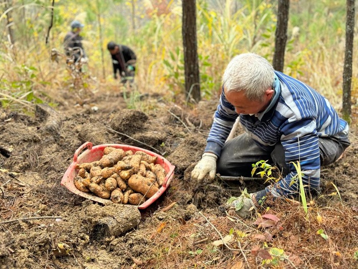 重慶市城口縣周溪鄉(xiāng)村民正在采挖天麻。新華社記者趙佳樂 攝