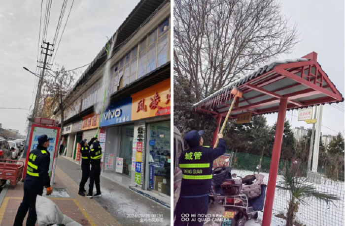 執(zhí)法隊(duì)員按照包抓機(jī)制提早進(jìn)入街區(qū),利用早晨低溫冰錐未掉落之前,利用長(zhǎng)桿對(duì)其清理。清理過(guò)程中,執(zhí)法隊(duì)員手握鐵桿,不畏嚴(yán)寒,熱情不減,為出行群眾多一些安全,多一些便利。兩天以來(lái),共出動(dòng)執(zhí)法人員240多人次,清理冰錐700多處,及時(shí)清除了安全隱患。這一小小舉措,彰顯了城管隊(duì)員“管好城市為人民”的服務(wù)理念,落實(shí)了“我為群眾辦實(shí)事”的服務(wù)宗旨,路過(guò)群眾紛紛交口贊?。▌⑿∪A)