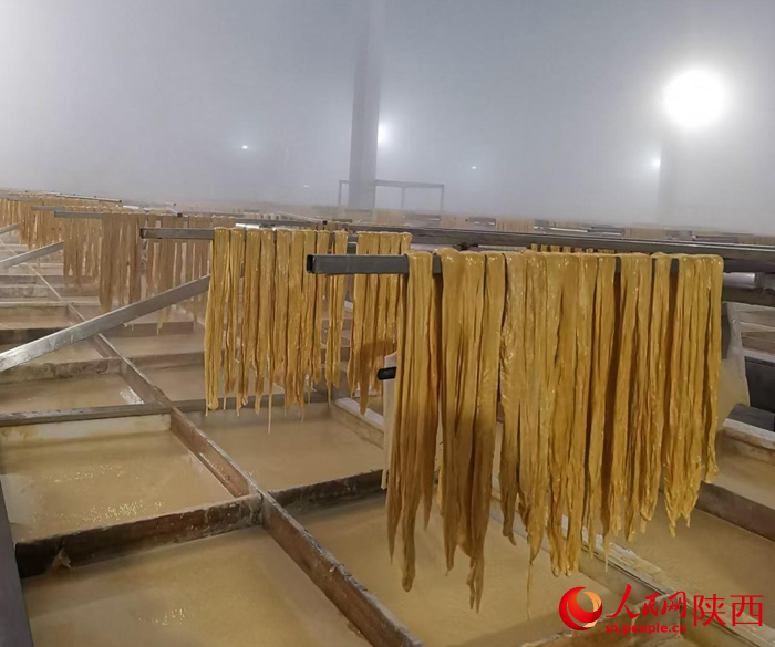 生產(chǎn)線上,剛從豆?jié){鍋里撈出來的新鮮腐竹。人民網(wǎng) 王麗攝