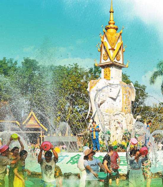 游客在西雙版納傣族園參加潑水狂歡。 本報(bào)記者 胡妤雅 攝