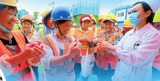 醫(yī)護(hù)人員向工人普及衛(wèi)生知識(shí)。 本報(bào)記者 陳飛 攝