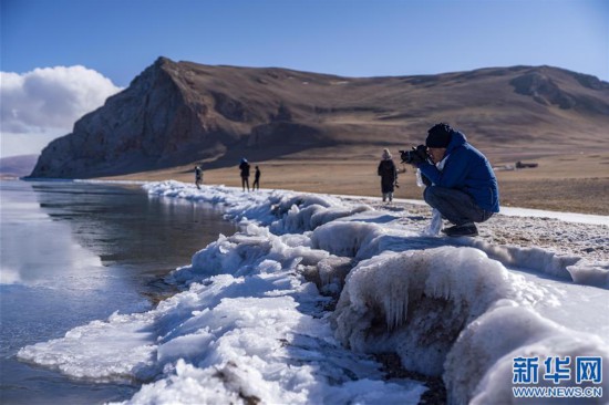 游客在色林錯湖邊拍照(12月15日攝)。新華社發(fā)(孫非 攝)