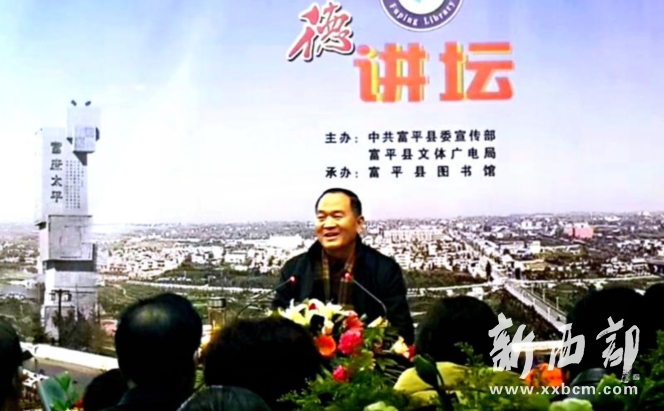 這次活動由富平縣圖書館承辦。富平文體廣電局局長雷建莊、渭南市作協(xié)副主席關中牛、渭南市作協(xié)秘書長姜芳、閻良區(qū)作協(xié)主席冉學東、富平縣圖書館館長張麗萍、富平縣文聯(lián)主席孟樂峰、富平縣作協(xié)主席楊英武、從西安趕來的作家林喜樂、李印功等在臺前就座。