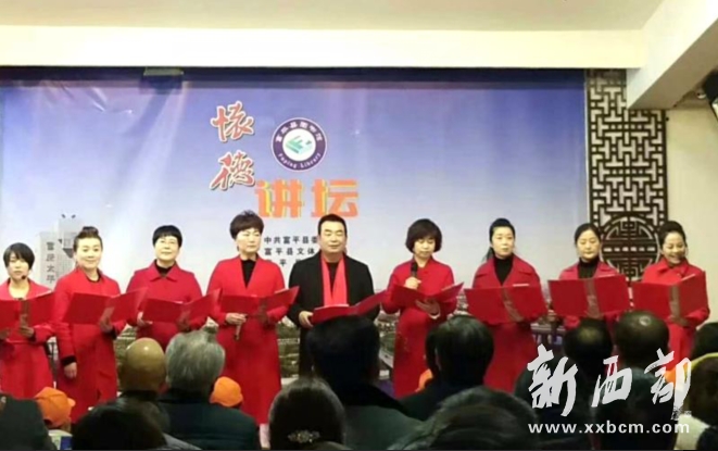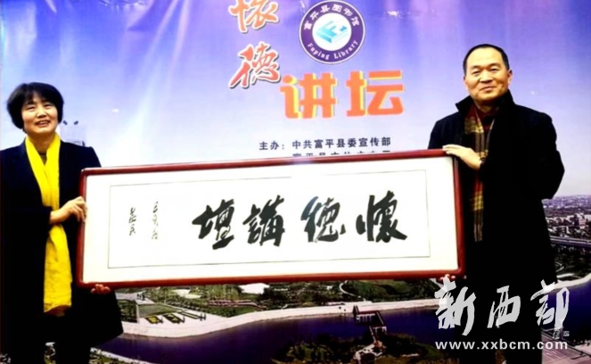 講座開始之前,黨益民為縣圖書館贈送了“懷德講壇”題詞,縣圖書館館長張麗萍回贈了館藏清康熙年間沈起潛《富平輿地圖及三尺嶺圖》拓片。九位朗誦愛好者集體朗誦了由王璐創(chuàng)作的詩歌《致敬黨益民》。文學愛好者代表為黨益民敬獻了鮮花。