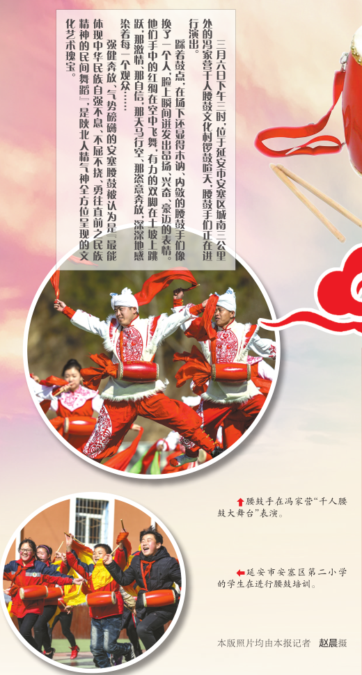 “安塞腰鼓源于軍營,根在民間,強健豪放、剛勁飽滿、氣勢磅礴,被藝術(shù)家認為是最能體現(xiàn)中華民族自強不息、不屈不撓、勇往直前之民族精神的民間舞蹈?!卑踩麉^(qū)副區(qū)長張志貴介紹。