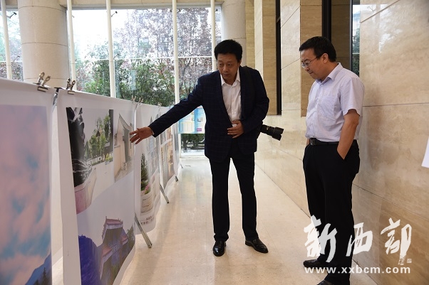 攝影家朱劍(左)向西京電氣總公司黨委書記楊新中講解作品創(chuàng)作過程。(張金勝 攝)