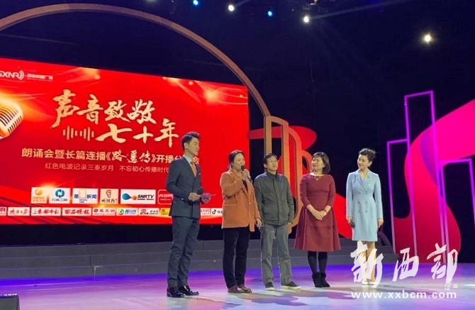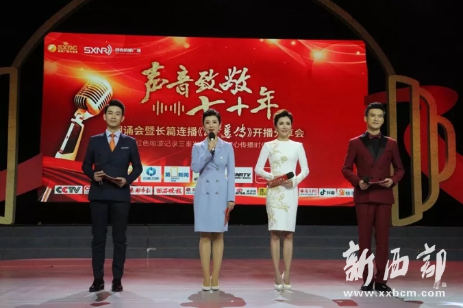 “1949年10月,伴隨著新中國的成立,陜西廣播事業(yè)誕生了, 70年的輝煌歷程,陜西廣電事業(yè)從廣播到電視再到融媒體發(fā)展格局,陜西廣電人緊隨時(shí)代步伐,披荊斬棘踏浪而行,為陜西改革發(fā)展大局提供了堅(jiān)強(qiáng)的思想保證、輿論支持和精神動(dòng)力。為了紀(jì)念陜西廣播事業(yè)發(fā)展歷程,展示陜西廣電人不忘初心、牢記使命、在融媒體時(shí)代繼往開來的精神風(fēng)貌,表達(dá)對(duì)投身改革先行者路遙等人的懷念與崇敬,我們今天在這里舉辦‘聲音致敬70年朗誦會(huì)暨長篇連播《路遙傳》開播儀式'?!?/p>