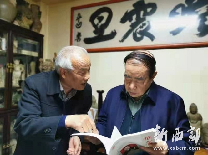 ▲李印功給賈平凹(右)贈(zèng)送長(zhǎng)篇小說(shuō)《胭脂嶺》。