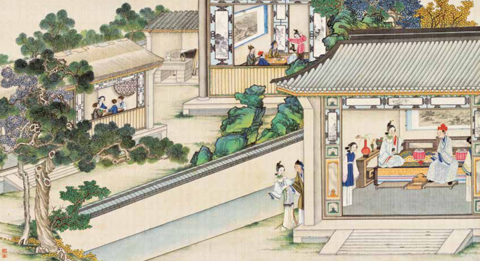 主要的人物的服裝、佩飾,以及房?jī)?nèi)陳設(shè)古玩、雅件,都采用了“泥金勾染”技法,在一些花卉、地毯、甬道上,還添了厚粉,營(yíng)造更立體逼真的視覺體驗(yàn)。