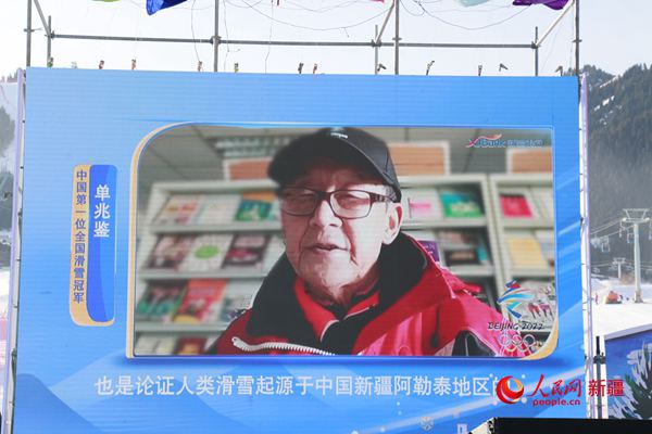中國(guó)第一位全國(guó)滑雪冠軍單兆鑒通過視頻送祝福。人民網(wǎng) 吉布吉瑪攝