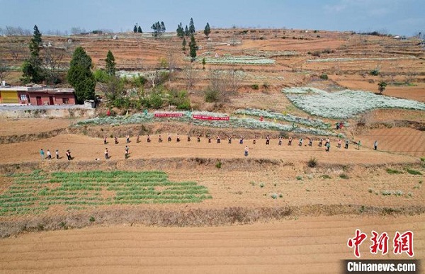 航拍考古勘探人員在貴州可樂遺址進行勘探。 應(yīng)騰 攝