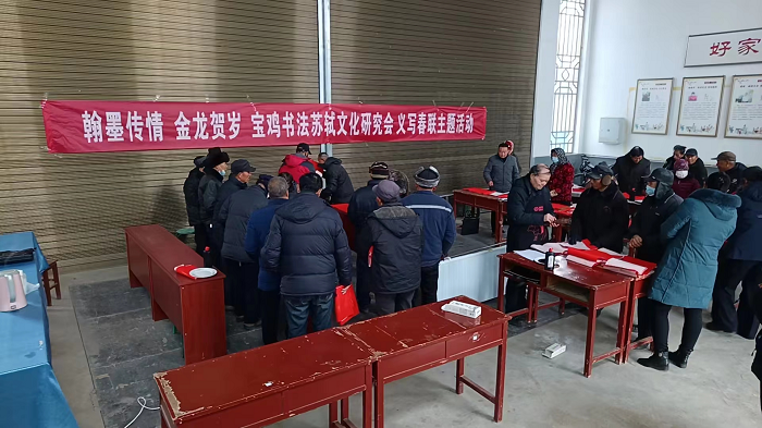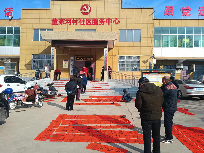 迎春飛雪天地寒,瑞氣瓊花兆豐年。新春佳節(jié)即將來臨,為豐富鄉(xiāng)村群眾的精神文化生活,營造喜慶祥和的節(jié)日氛圍,1月24日上午,范家寨鎮(zhèn)董家河村駐村工作隊(duì)和村委會邀請寶雞市蘇軾文化研究會在董家河村開展“翰墨傳情 金龍賀歲”春聯(lián)義寫活動,9名書法名家現(xiàn)場揮毫潑墨,為脫貧戶送上了一份精心烹制的“文化大餐”。