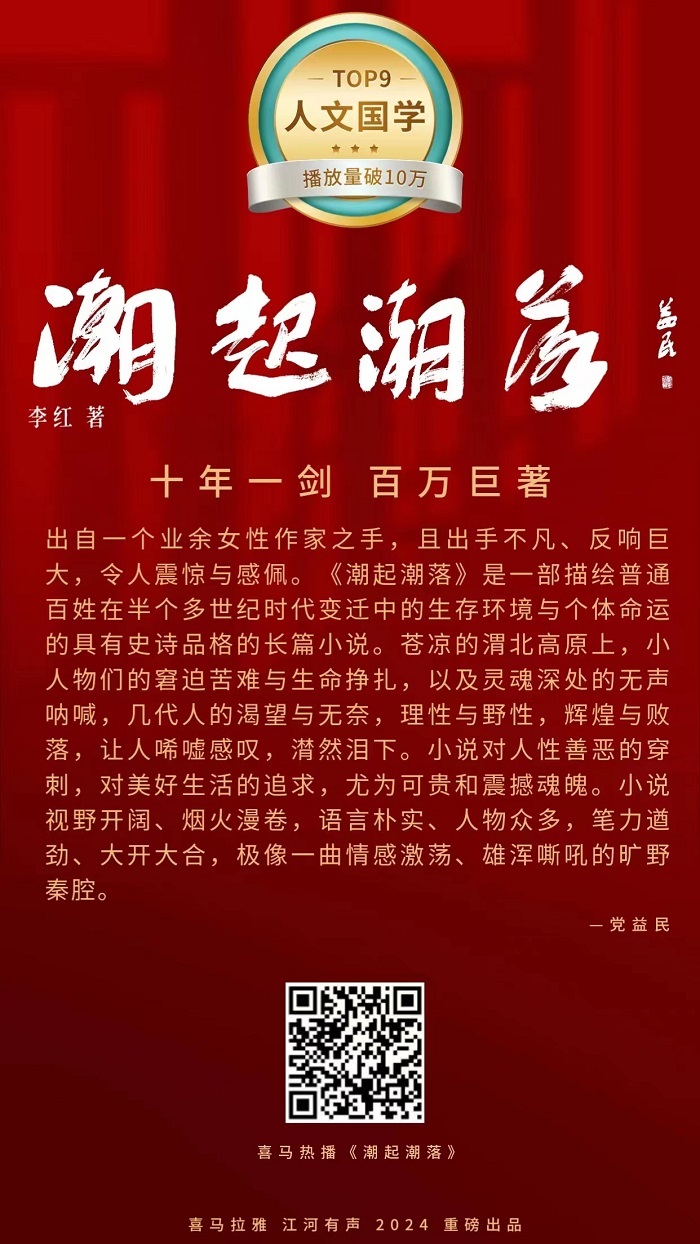 我花費十年時間創(chuàng)作的三卷本一百萬字的長篇小說《潮起潮落》有聲書,元月2日在喜馬拉雅平臺上架后,有了不俗的表現(xiàn),我“擔心丟人”的心剛剛放下,我的高中同學、富平籍作家、《華文月刊》雜志常務副主編李印功,就向我“發(fā)難”說:李紅,你一個肩不能挑手不能提的弱女子,連四季農(nóng)活都分不清楚,咋能寫出來在有聲書市場引起這么大反響的《潮起潮落》?問得我一時無語!我還沒有來得及回答,李印功的話又來了:我建議你把你為什么要寫《潮起潮落》、又憑什么竟然寫出了《潮起潮落》的前后經(jīng)過、左右思考,給喜歡《潮起潮落》的文友們“交代”一下吧!