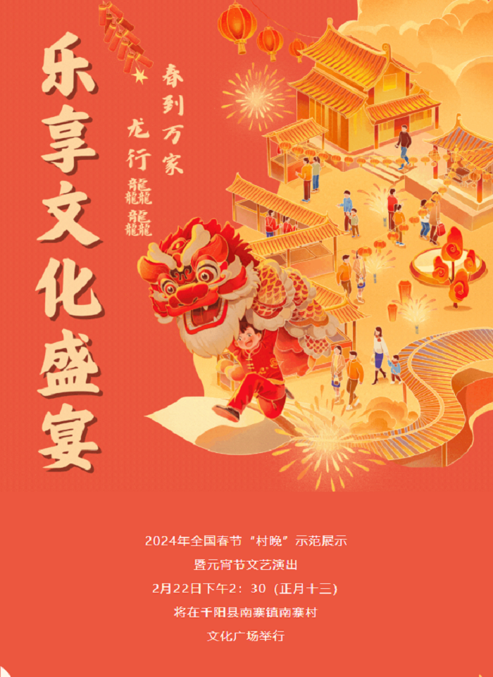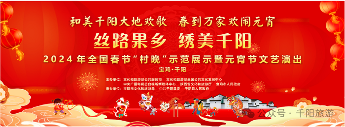 2024年全國春節(jié)“村晚”暨元宵節(jié)文藝演出活動由國家文化和旅游部公共服務(wù)司、全國公共文化發(fā)展中心、中央廣播電視總臺視聽新媒體中心、陜西省文化和旅游廳、寶雞市人民政府主辦,寶雞市文化和旅游局、中共千陽縣委、千陽縣人民政府承辦,寶雞市群眾藝術(shù)館、中共千陽縣委宣傳部、千陽縣文化和旅游局、千陽縣南寨鎮(zhèn)人民政府組織實施。