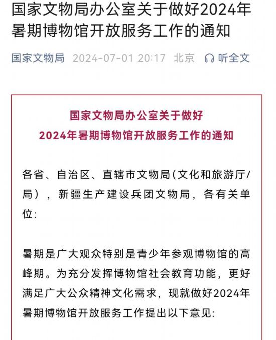 國家文物局7月1日發(fā)出通知,就做好2024年暑期博物館開放服務(wù)工作進行部署。通知明確,各級文物行政主管部門要加強指導(dǎo),科學(xué)評估場館承載量,創(chuàng)新舉措,通過多種方式提高觀眾參觀博物館便利化水平。