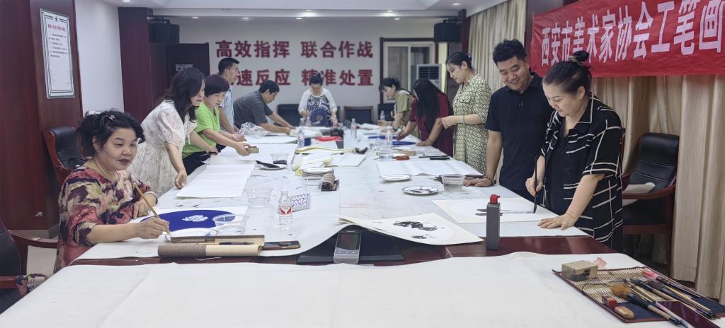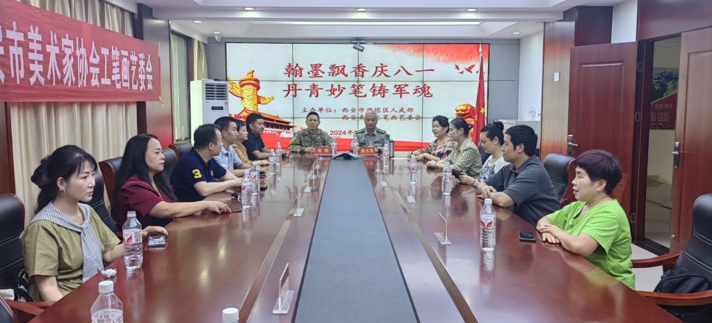 2024年8月2日,西安市美術(shù)家協(xié)會工筆畫藝委會13位書畫家,在西安市美術(shù)家協(xié)會副主席李敏的帶領(lǐng)下,來到西安市雁塔區(qū)人民武裝部,開展了一場生動活潑的“翰墨飄香慶八一丹青妙筆鑄軍魂”了解軍營生活、真誠為軍人贈送書畫聯(lián)誼活動,受到雁塔區(qū)武裝部部長易志浩、政委李剛及同志們的熱情接待。